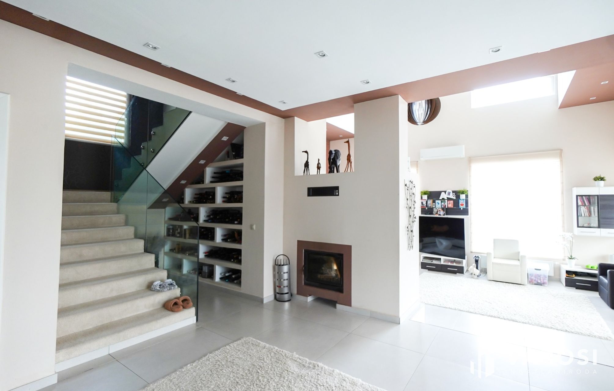 Az épület tágas, világos, a nappali amerikai tipusú loft megoldást kapott, hangulatos kandallóval és természetesen hatalmas üvegfelületekkel. A kilátás az épület minden pontjáról, bármely helyiségéből élvezhető.