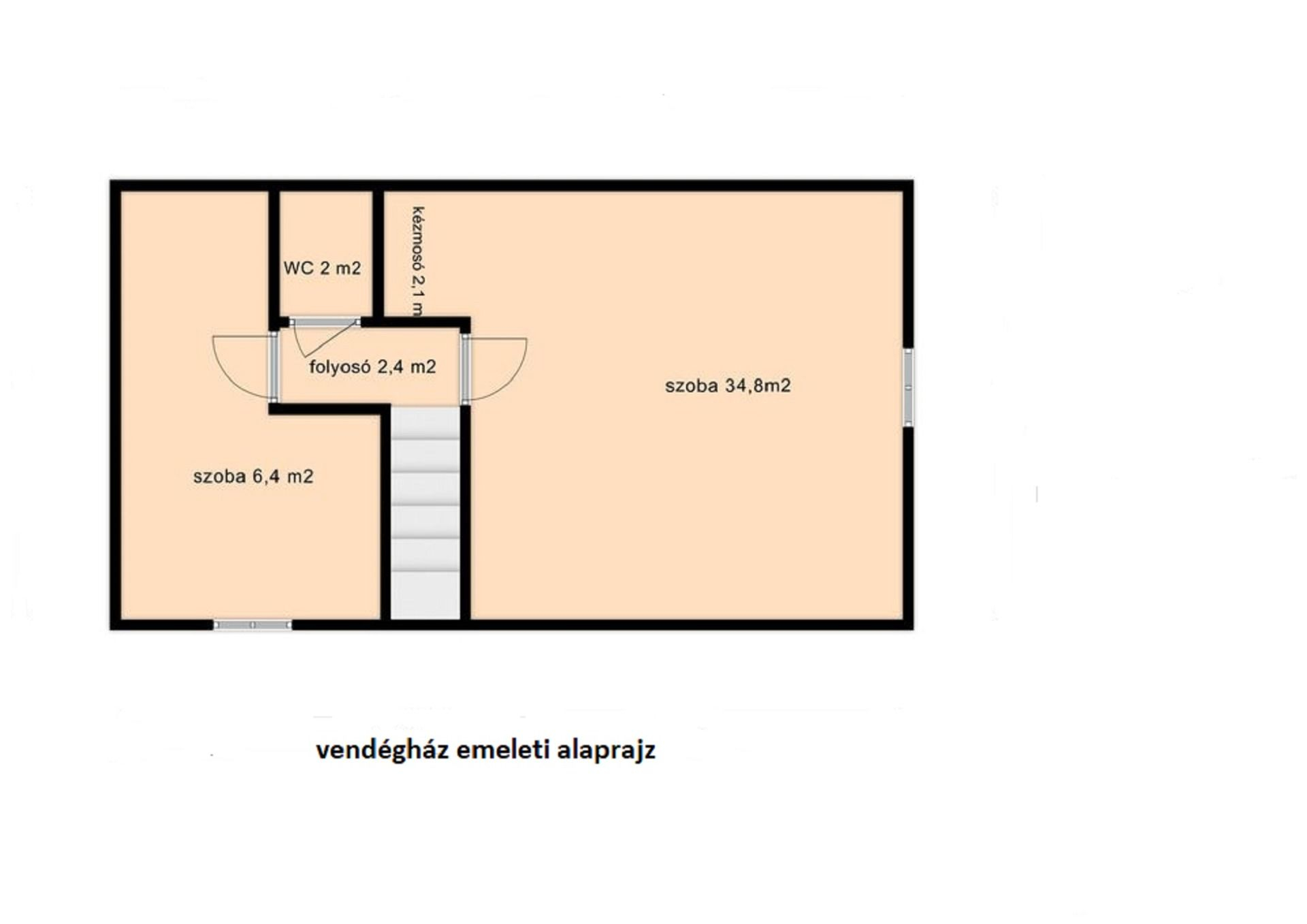 Az udvaron elhelyezkedő, szintén kétszintes vendégház földszintjén egy nappali-étkező, egy konyha, fürdőszoba és WC található, emeletén két szoba, közlekedő és WC.