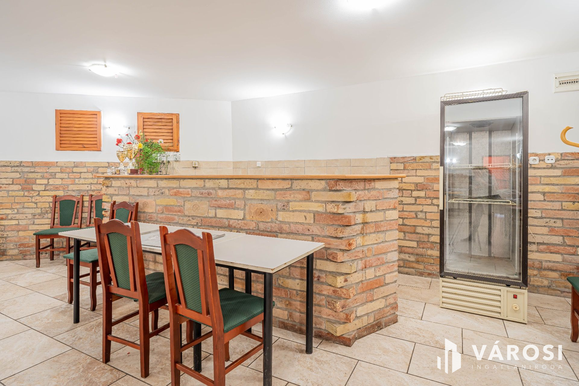A földszinten egy utcai bejáratos meleg és hidegkonyhás étterem található, amely 42 fő kényelmes befogadására alkalmas, akár kisebb rendezvények lebonyolítására is kiváló helyszínt ad. A szinten található még egy bárrész és a mosdók. A konyhai rész praktikus elosztású. Az étteremből a zárt udvarra jutunk ki, ahol nyaranta kerthelyiség üzemelt.