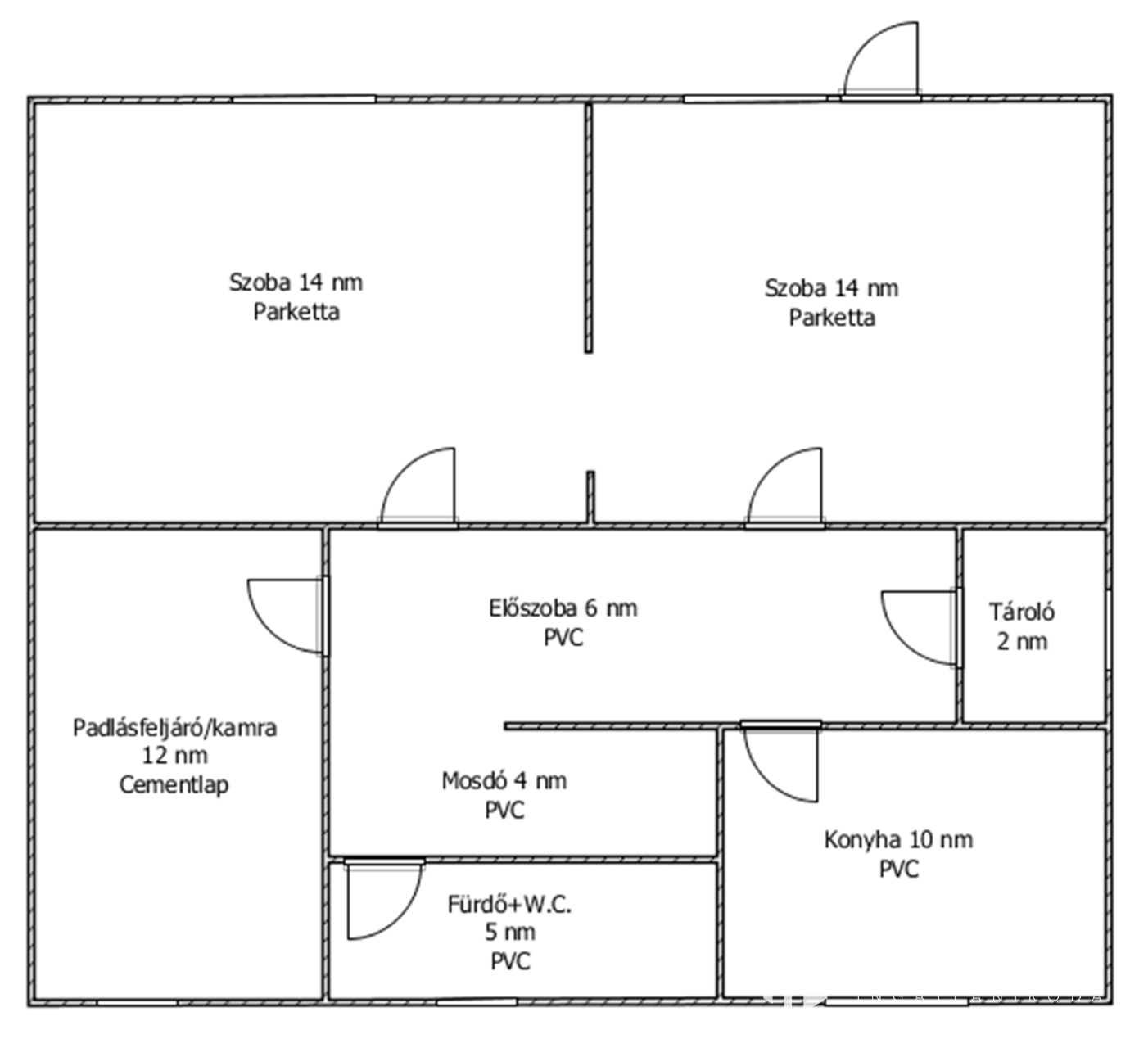 Helyiségei: 2 szoba, előszoba, fürdőszoba, konyha, kamra/padlásfeljáró, mosdó, tároló, az alsó szinten 20 nm-es pince.