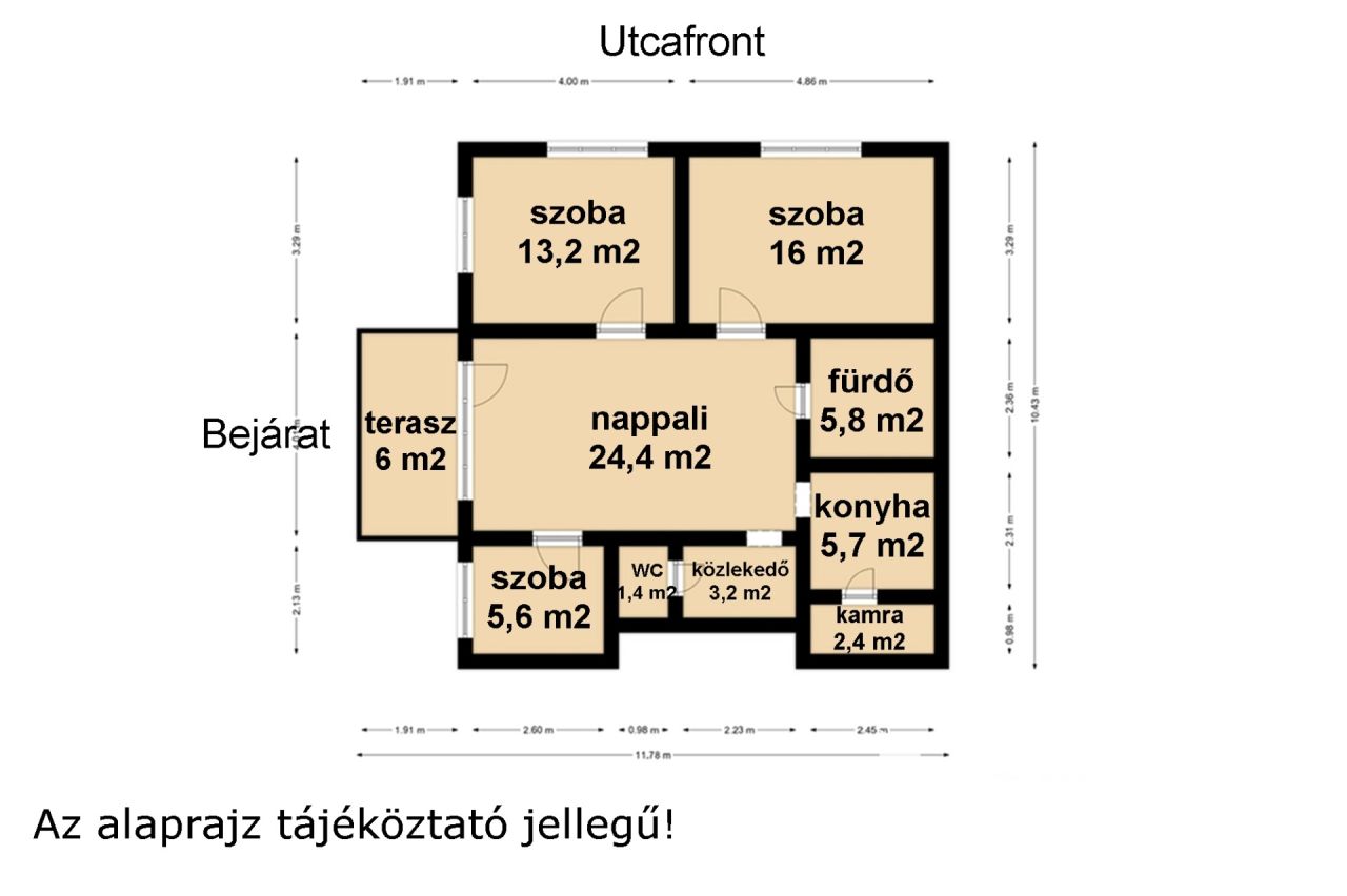 A épület nappaliból, 2,5 szobából, konyhából, kamrából, fürdőszobából és WC-ből áll, így tökéletes választás lehet családoknak vagy akár pároknak is.