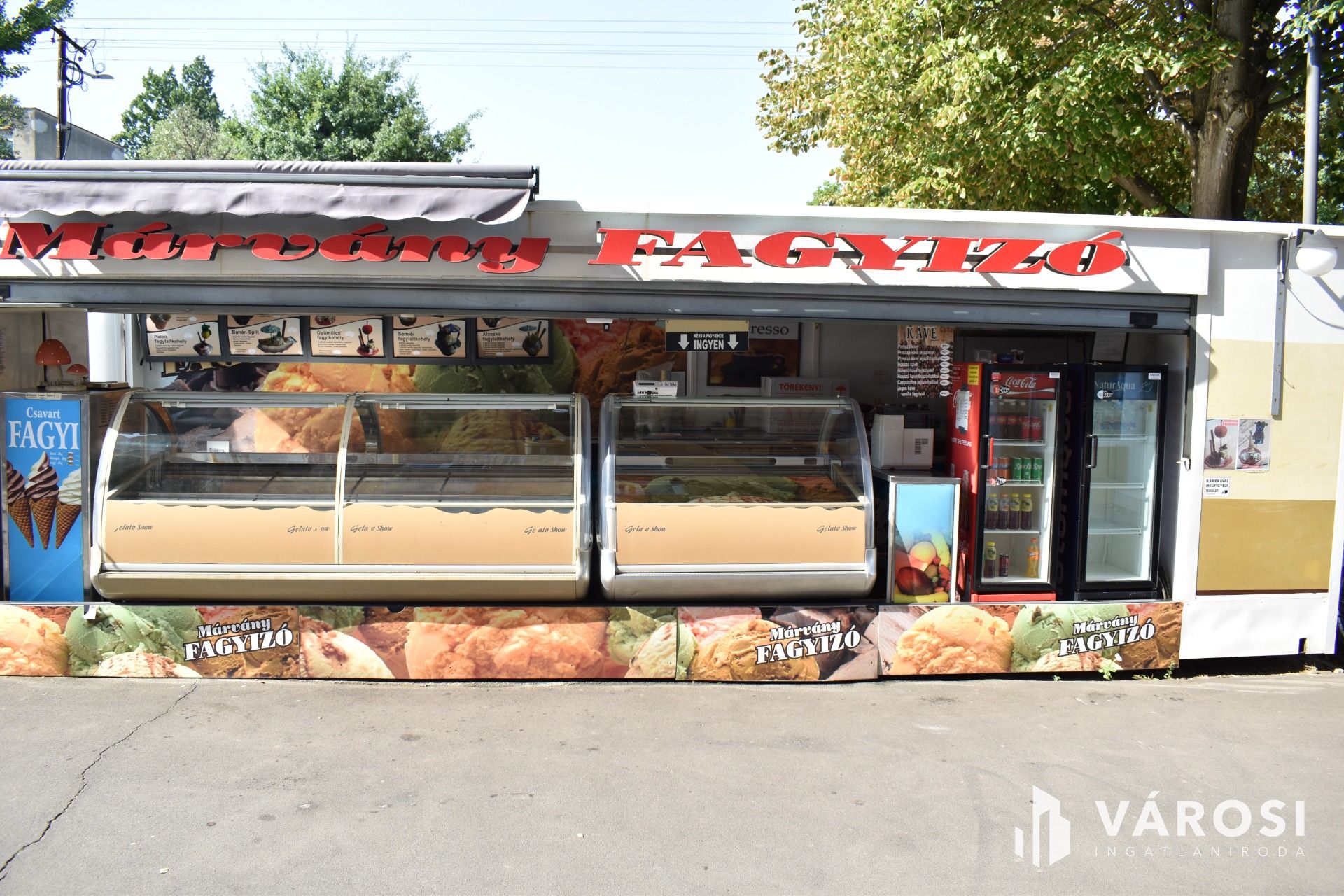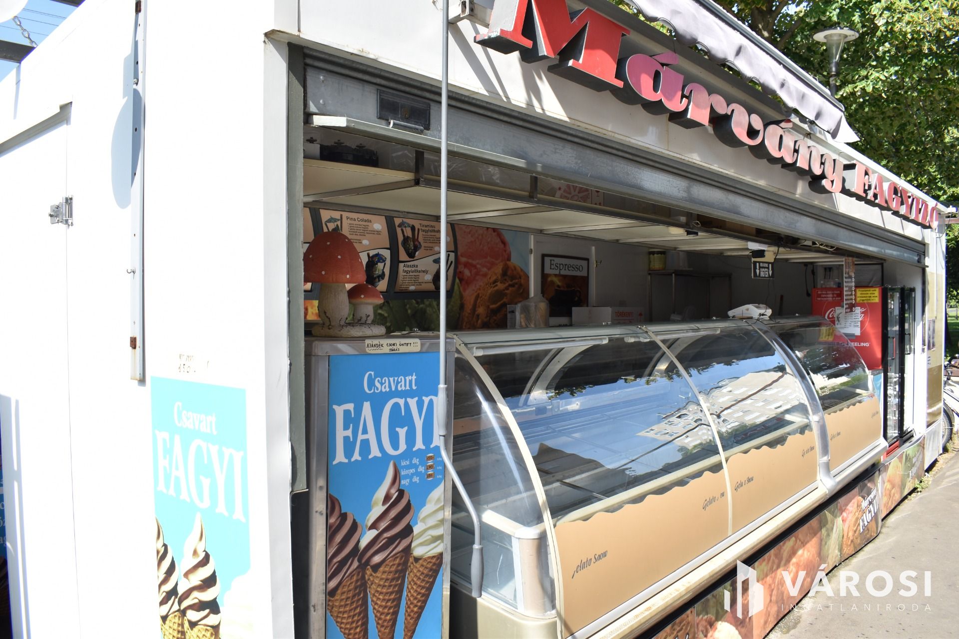 A vételár tartalmazza a fagylaltozóban lévő összes gépet, hűtőt, kerti garnitúrát és felszerelést.