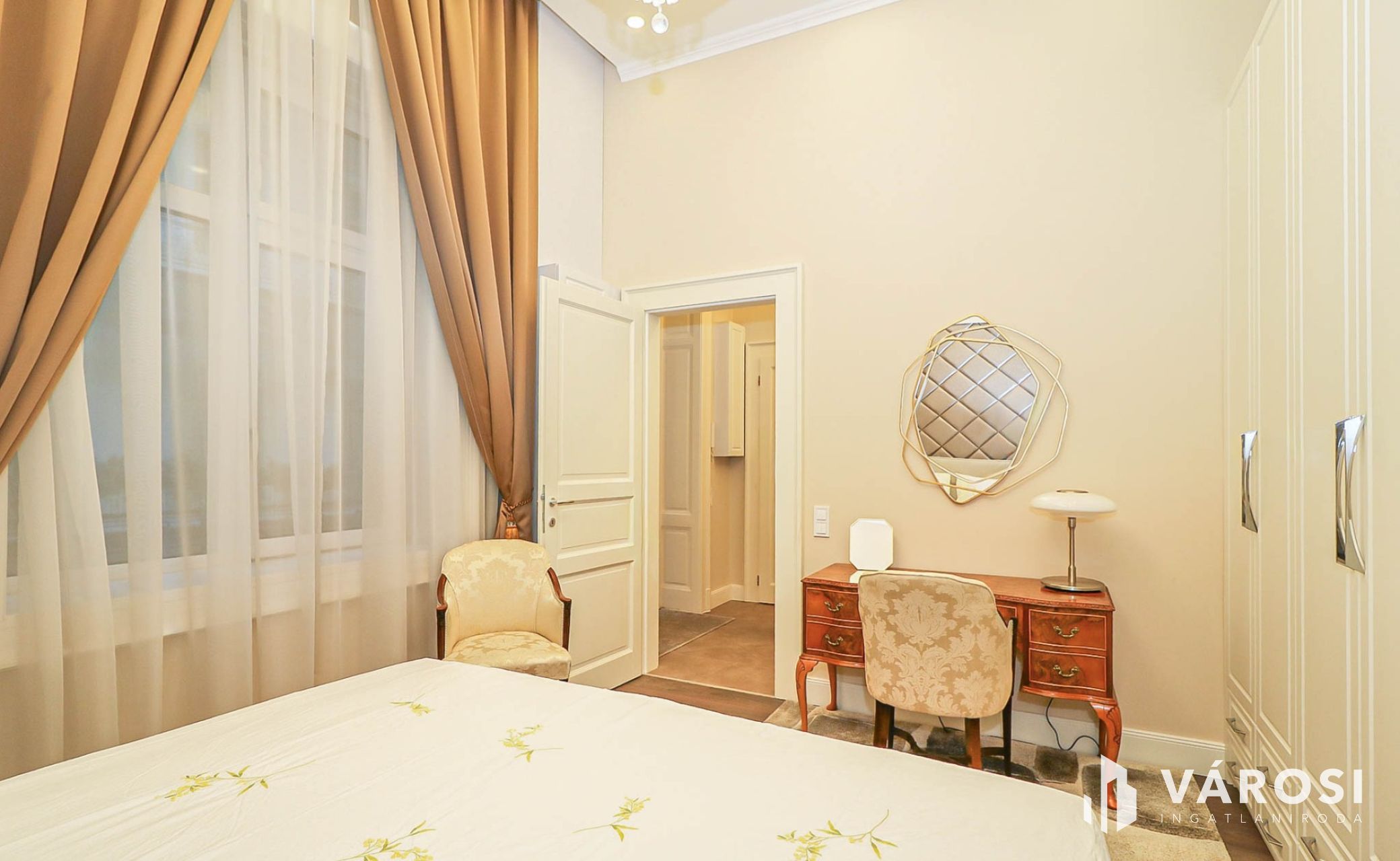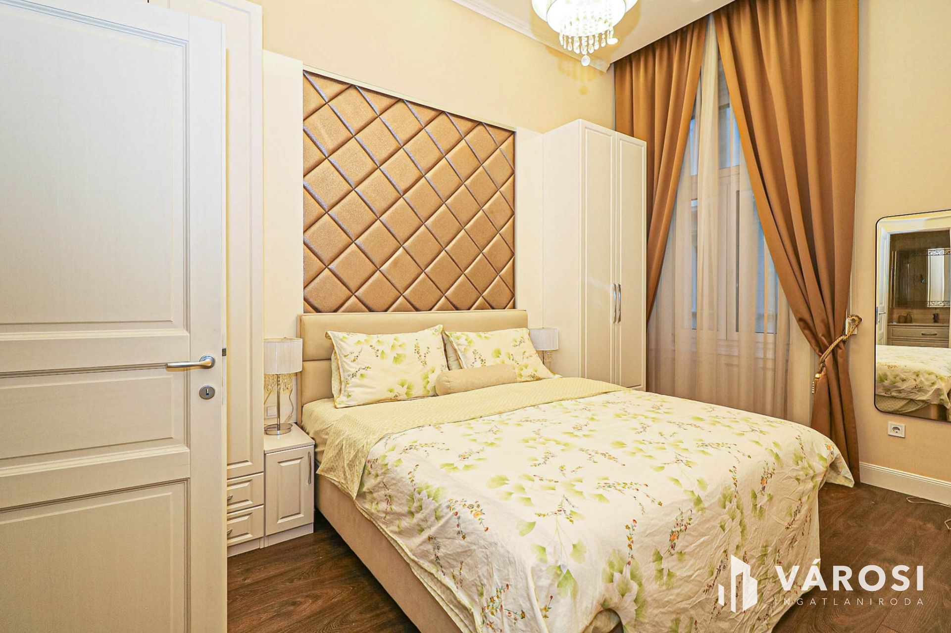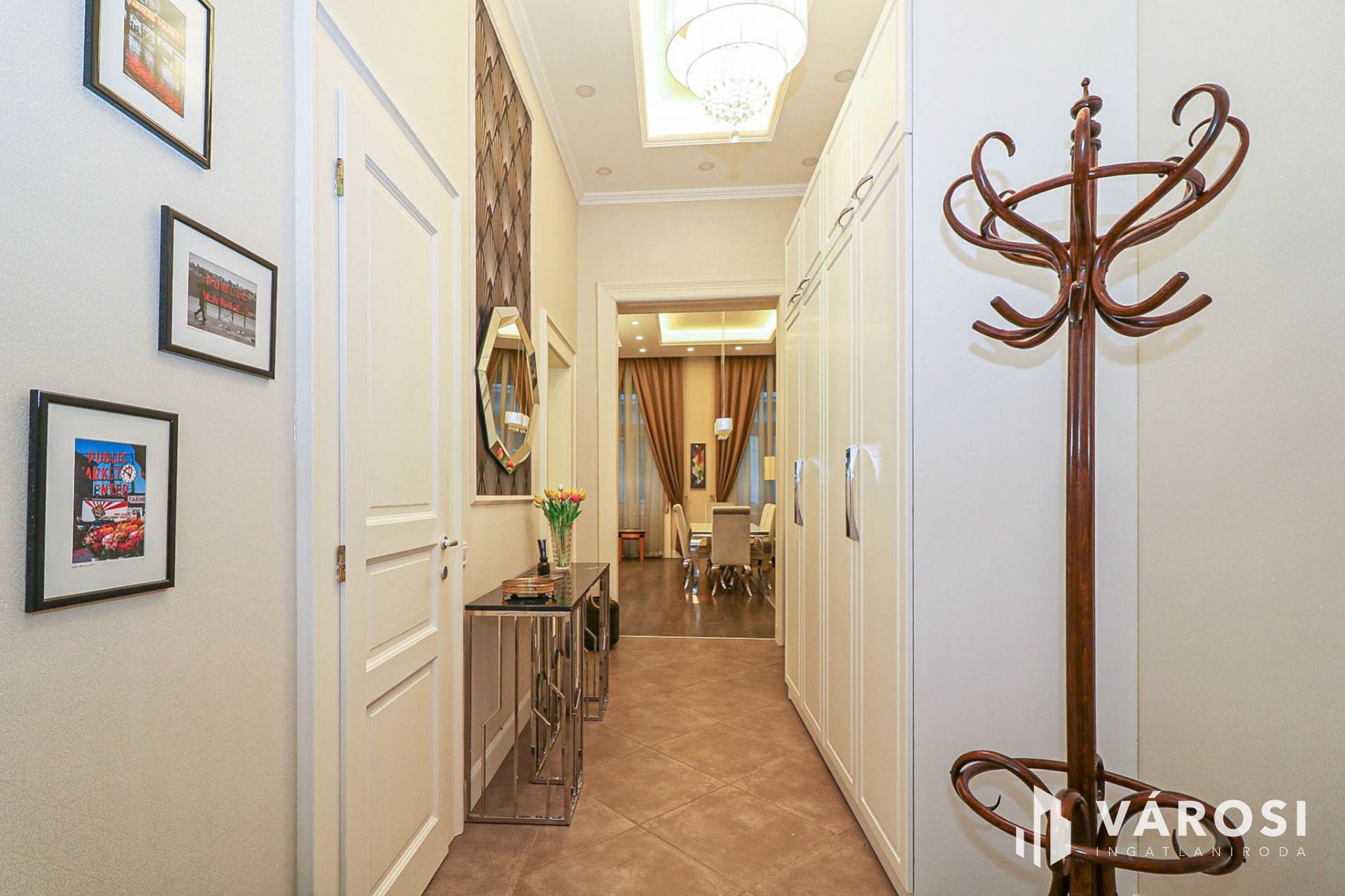 Az egész lakásra jellemző az elegancia, rejtett világítások, csillárfény, bézs–arany tónusok, nagy ablakok, vastag drapériák.
