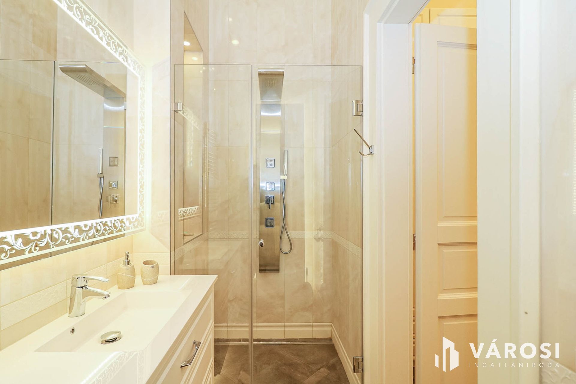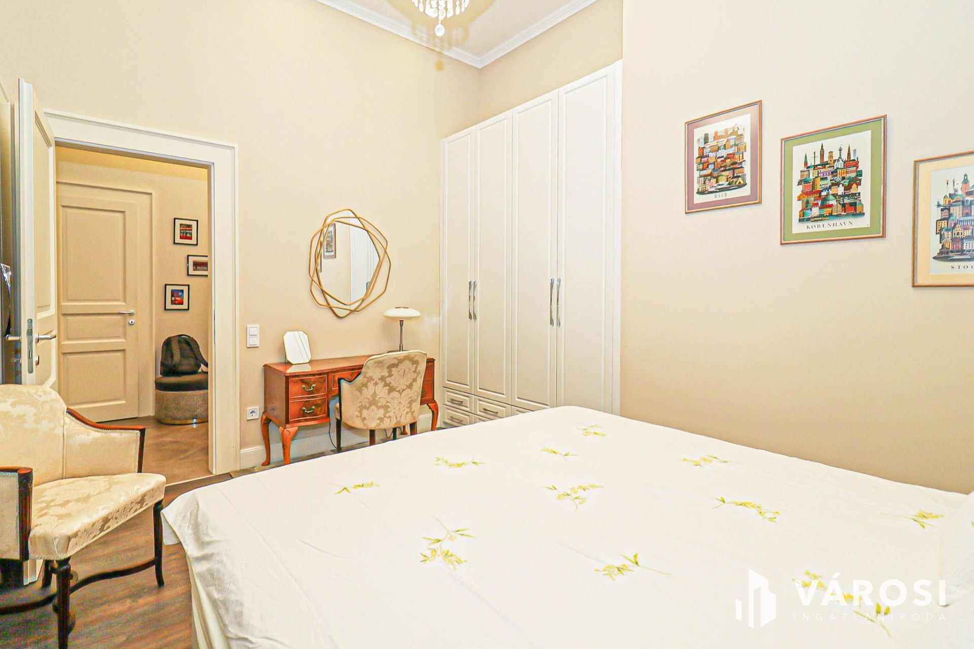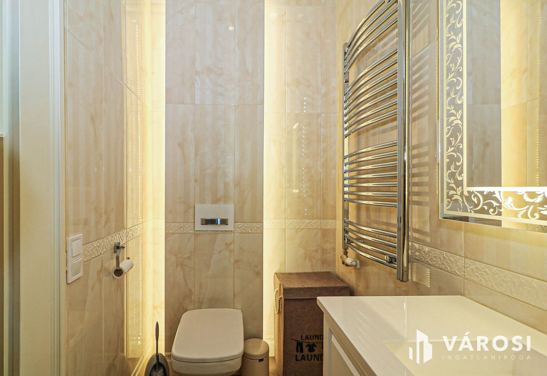 Az egész lakásra jellemző az elegancia, rejtett világítások, csillárfény, bézs–arany tónusok, nagy ablakok, vastag drapériák.