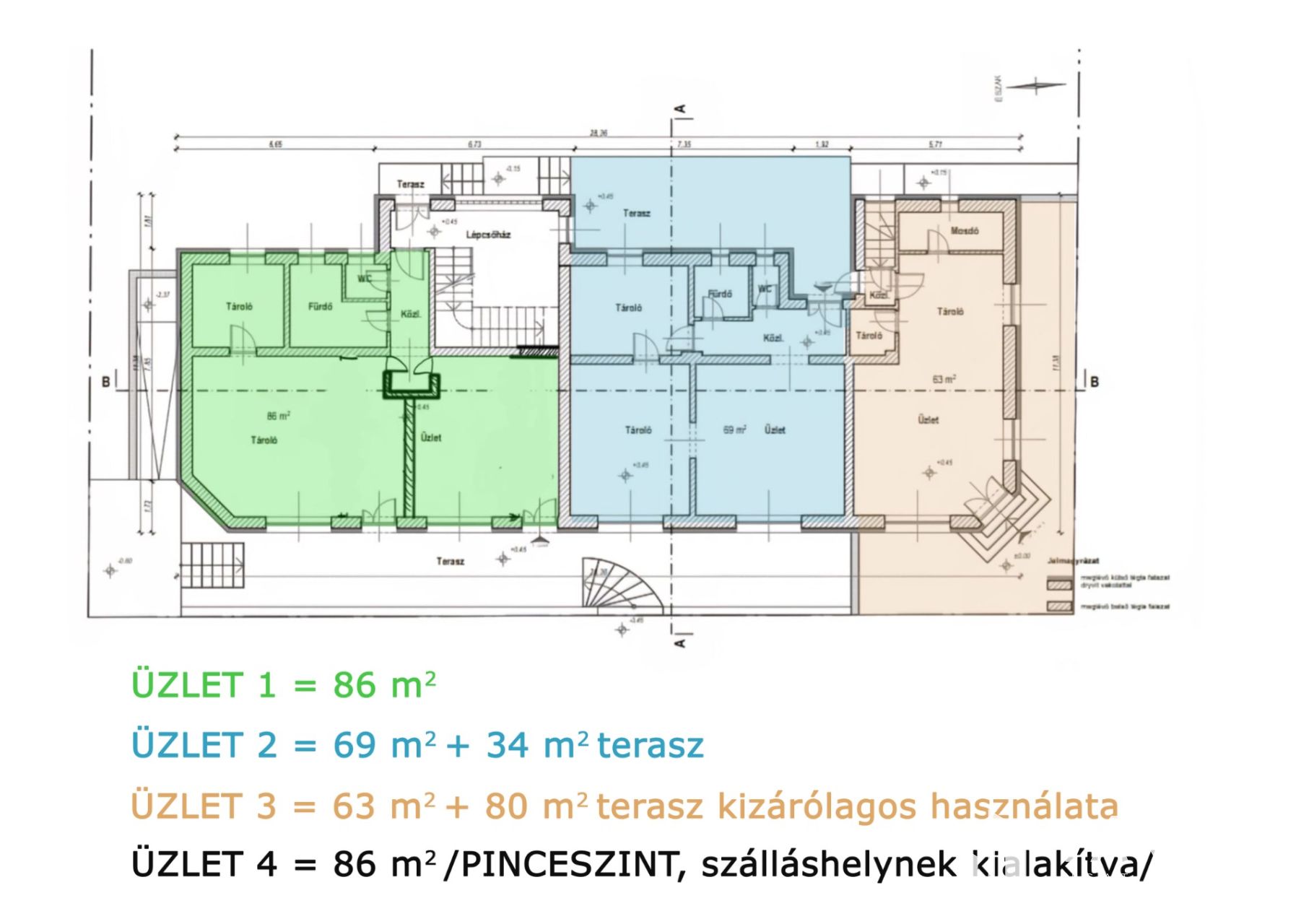 - Földszint = 3 db utcafrontos üzlethelyiség teraszokkal (86 m2 + 69 m2 +63 m2)