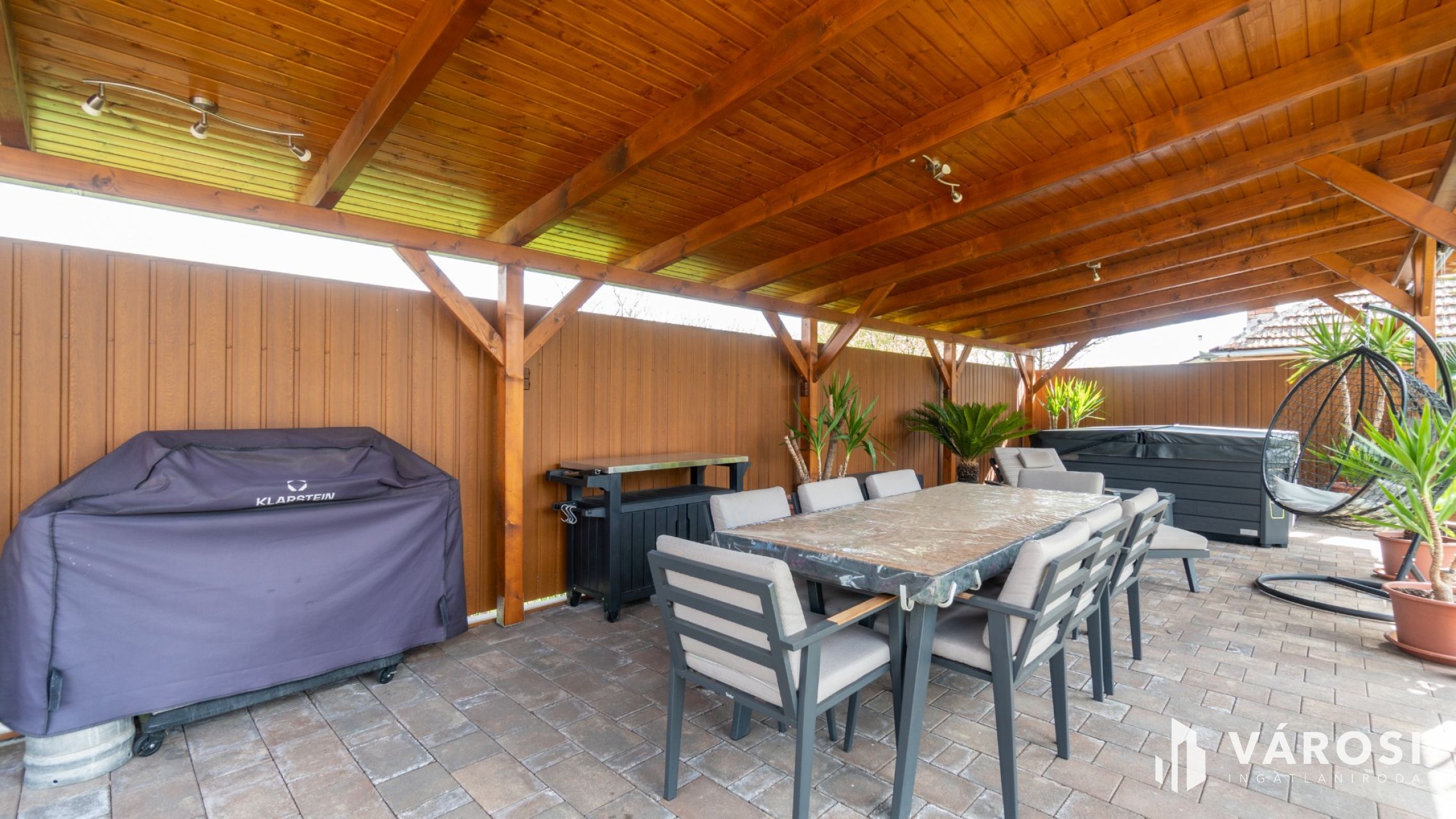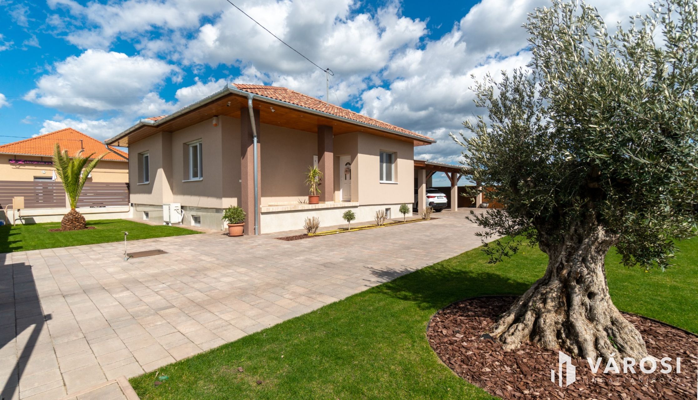 A gyönyörűen parkosított kert pálmafákkal és olajfával van teleültetve, automata öntözőrendszer van kiépítve, valamint fúrt kút is rendelkezésre áll. Az udvarban egy 40 m²-es fedett terasz is helyet kapott, így a szabadidő kellemesen tölthető a friss levegőn. Az autók elhelyezésére egy elektromos garázsajtókkal felszerelt 68 m² dupla garázs, valamint az előtte elhelyezkedő 80 m²-es fedett gépkocsibeálló áll rendelkezésre. A biztonságról a kiépített kamera- és riasztórendszer gondoskodik.