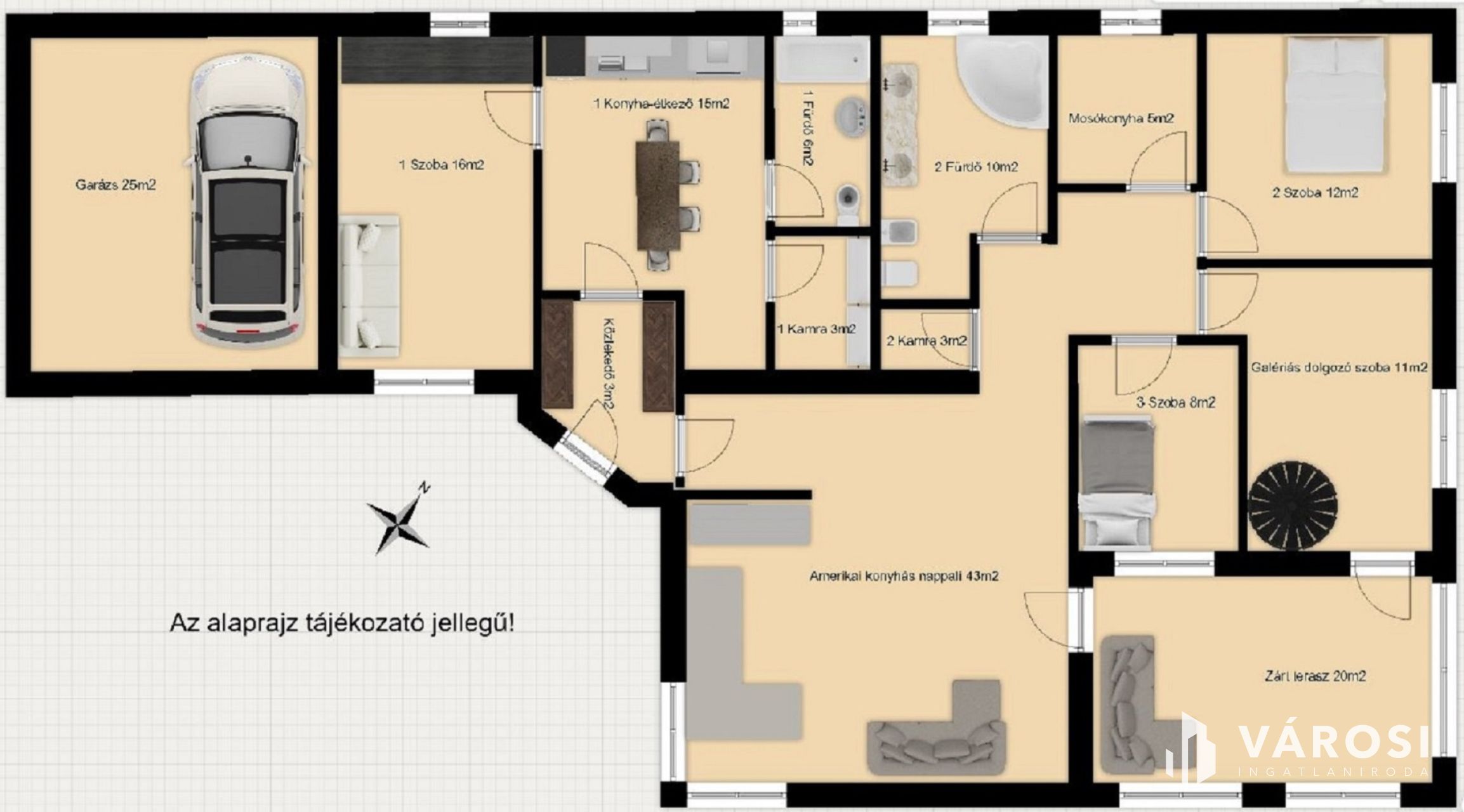 • tágas nappali-konyha és közlekedő (~46 m²)