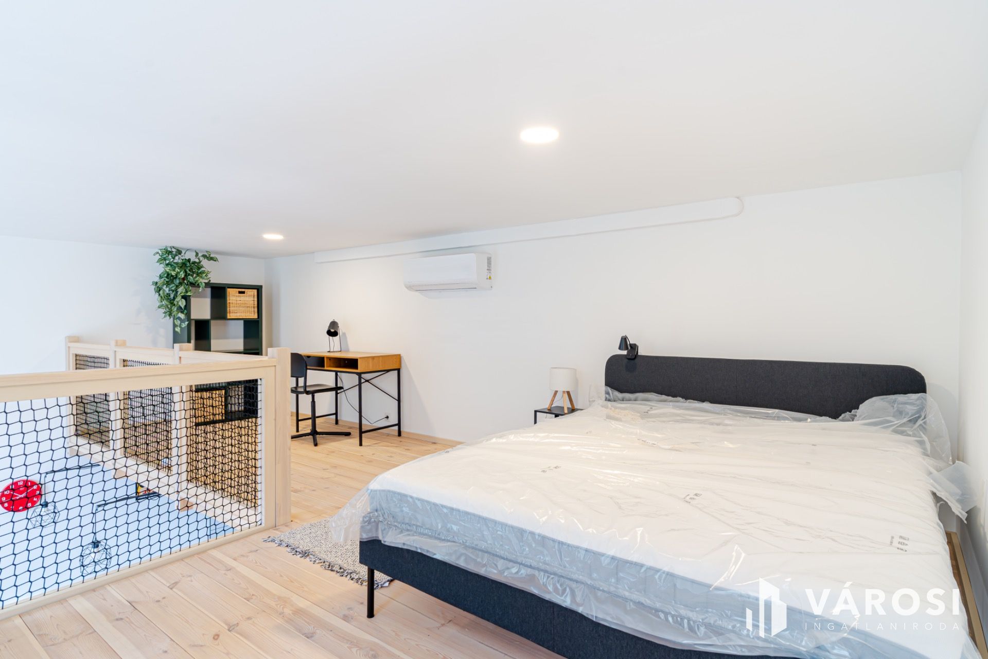 A kisebb lakás (35 m² + 13 m² galéria) galériás megoldással, kreatív beépítésekkel és modern dizájnnal.