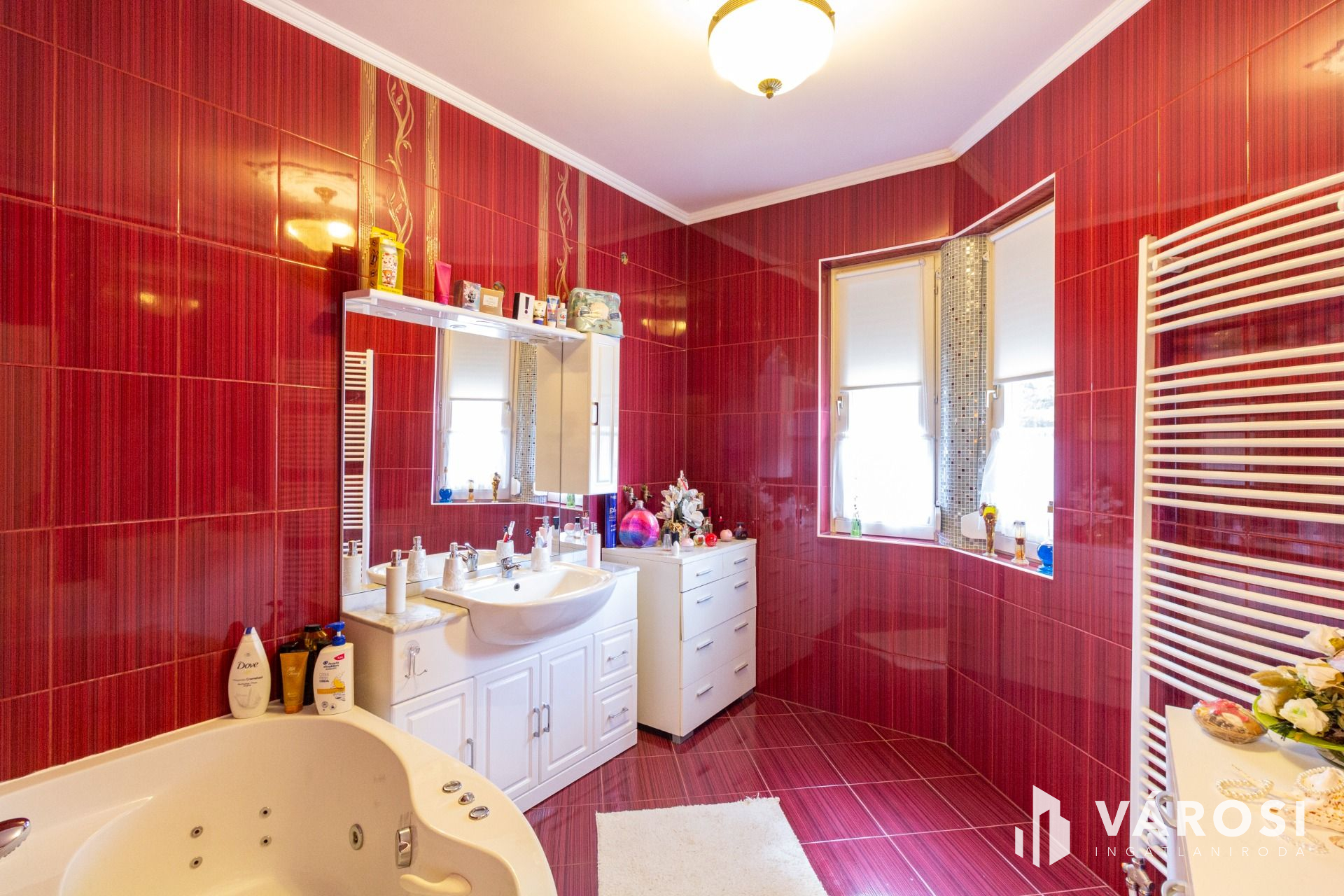 A fürdőszoba a 30 fúvókás jakuzzikáddal egyedi megoldású, de tusoló panel is rendelkezésre áll, valamint egy törölköző szárító is található a helyiségben.