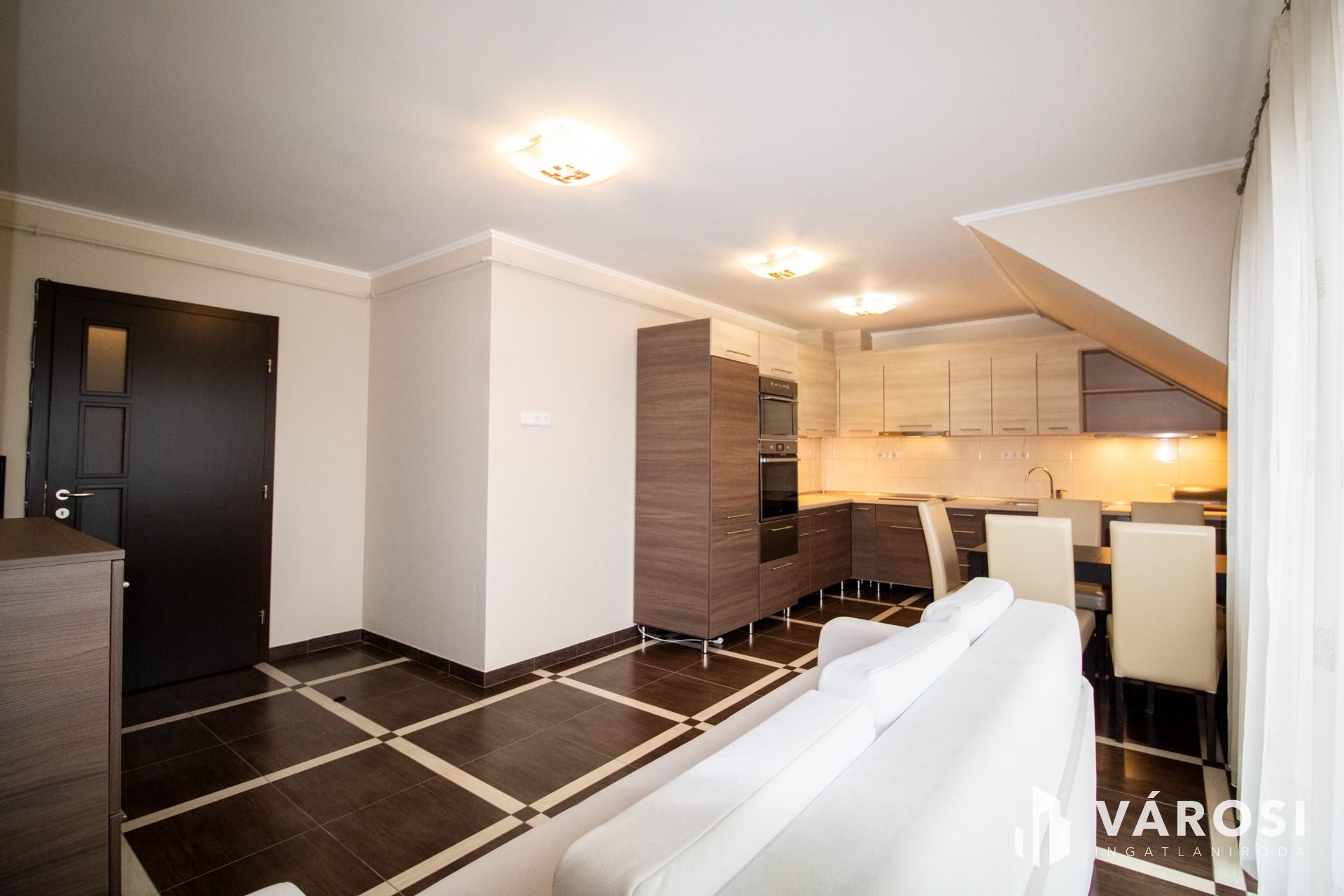 A lakás az első emeleten, a tetőtérben helyezkedik el, ahová kizárólag ehhez az ingatlanhoz tartozó, saját lépcsőházon keresztül juthatunk fel. A belső terek fiatalosak és rendkívül praktikus elrendezésűek: a közlekedőből nyílik a világos nappali és a modern konyha–étkező, amelyhez egy elegáns, kovácsoltvas korlátos erkély kapcsolódik. A két hálószoba jól szeparált, a külön WC és a mindkét irányból megközelíthető fürdőszoba pedig gondosan átgondolt, kényelmes megoldást nyújt a mindennapokban.