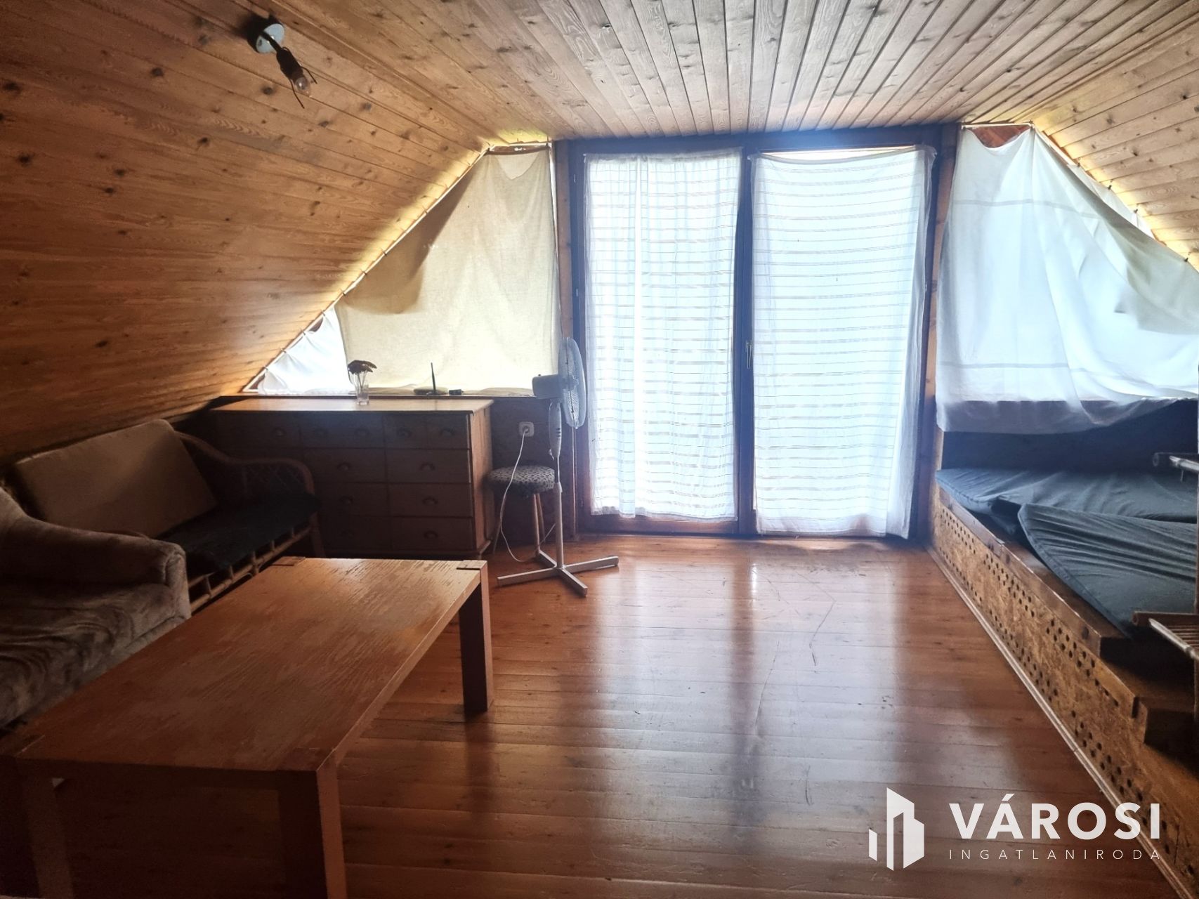 A "felsőház", amely 100m2 alapterületű és jelenleg két apartmanra van osztva. Szoba, konyha, fürdőszoba, mindkettő önálló terasszal. Valamint egy teraszról nyíló, közös háztartási helyiség tartozik mindkét lakáshoz.