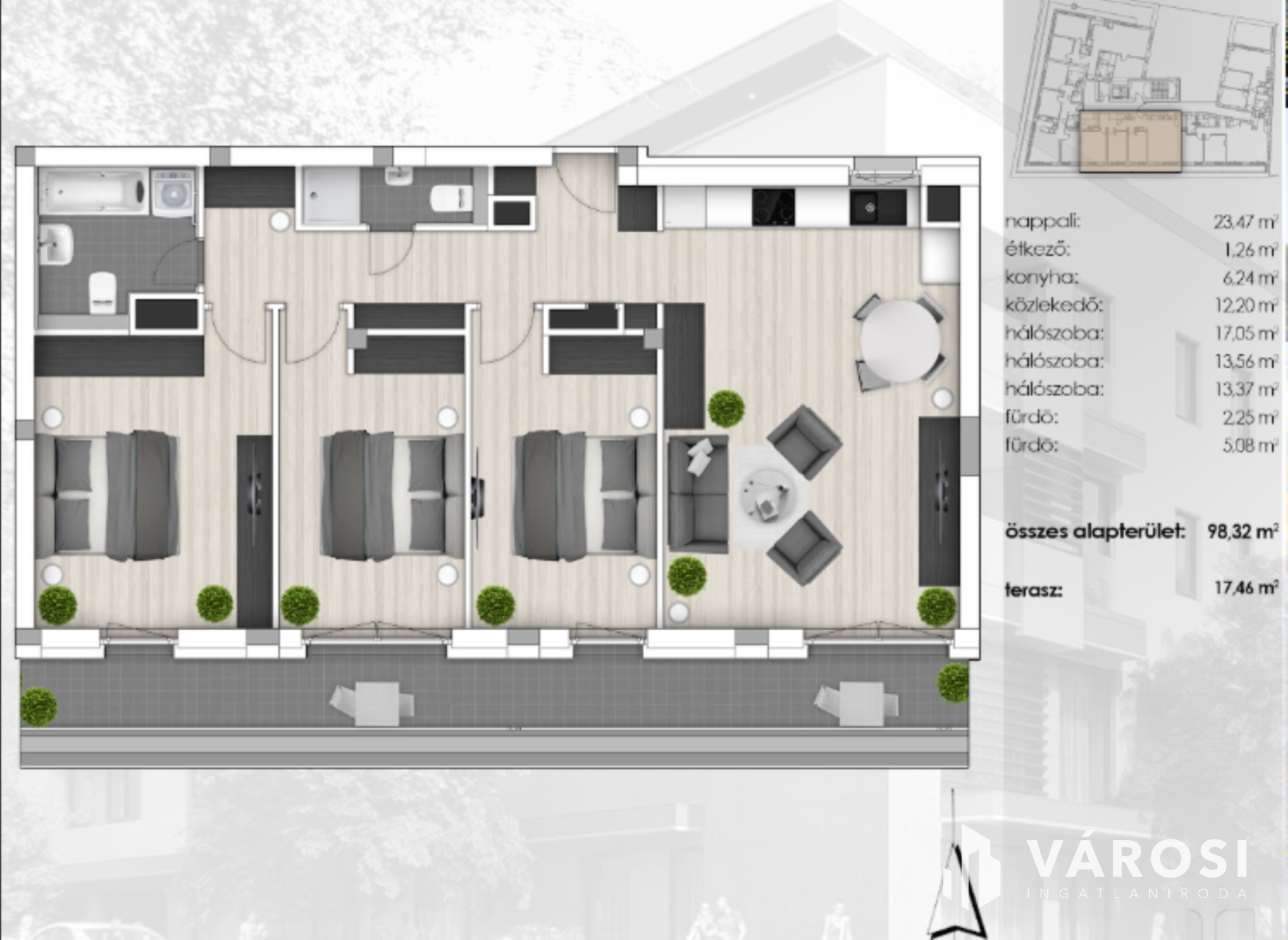 98,32 m² alapterület, három teljes értékű különálló szoba