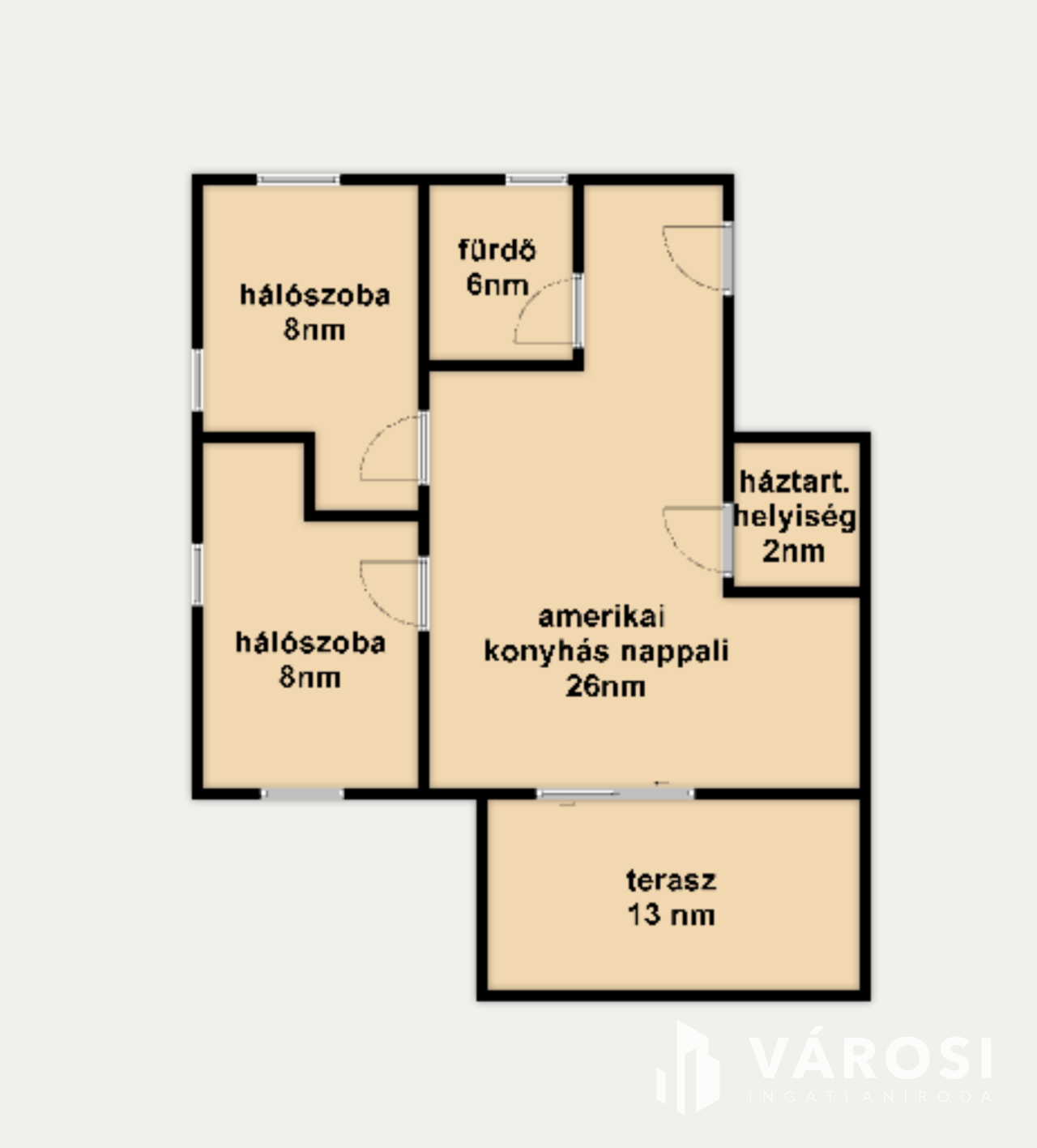 Az ingatlan elosztása kiváló, egy amerikai konyhás nappali, 2 hálószoba, egy zuhanyzós fürdőszoba, valamint egy háztartási helyiség (külön WC-vel) található benne. A nappaliból egy 13 m²-es fedett teraszra léphetünk ki, melyhez egy kizárólagos használatú 35 m²-es kertrész kapcsolódik.