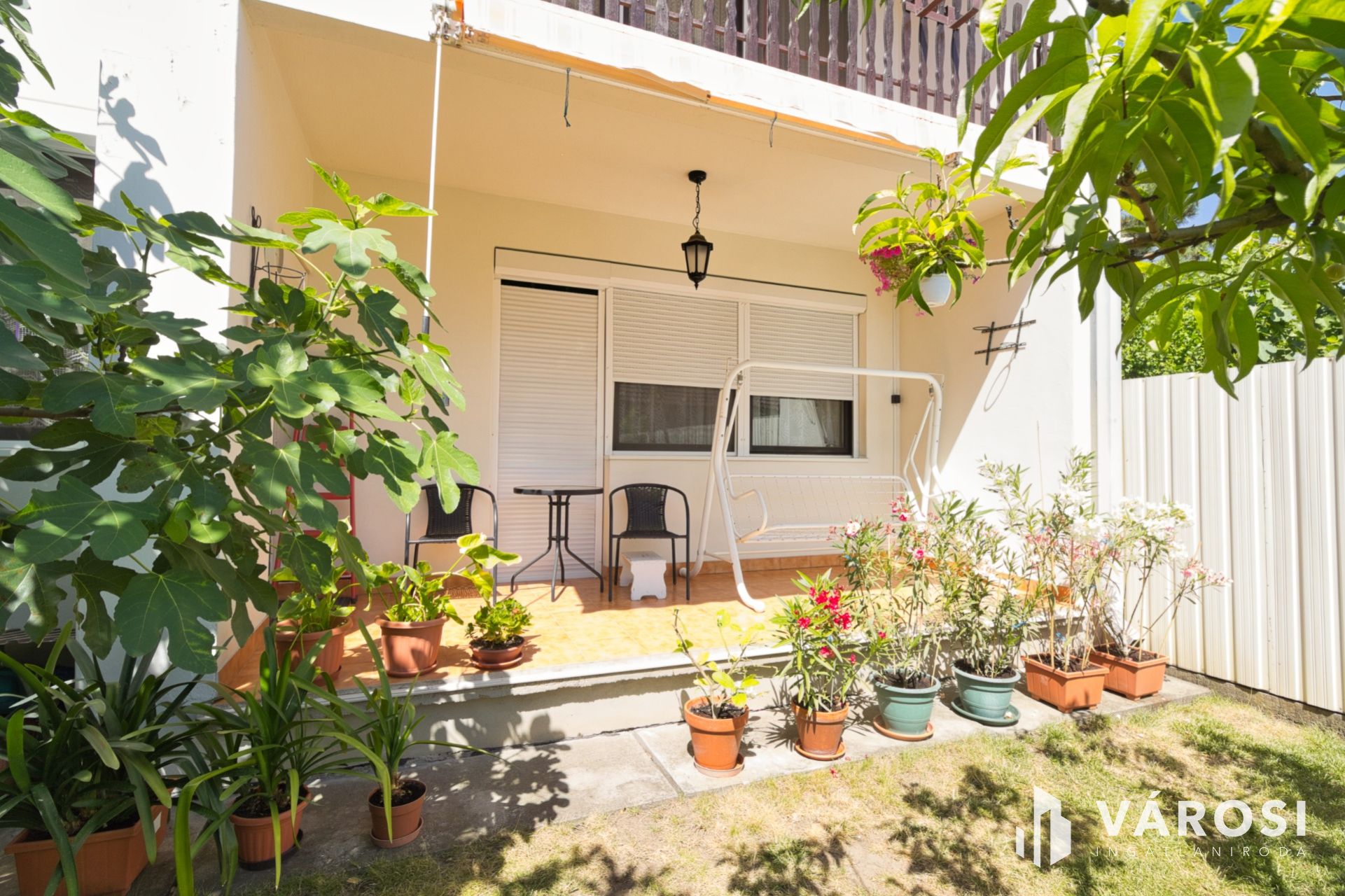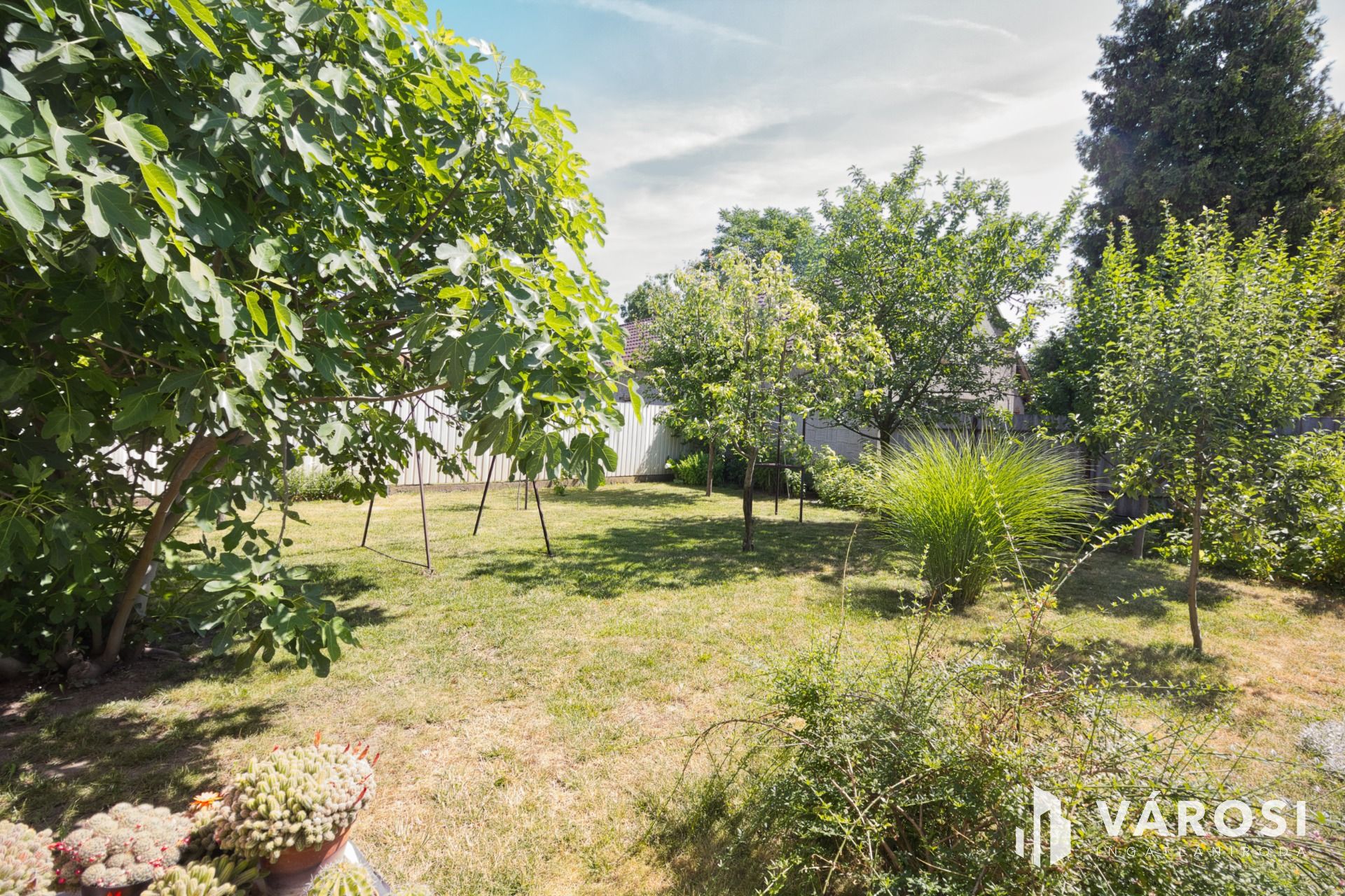 A ház mögötti udvaron termő bio cseresznye, körte, és füge biztosít gyümölcsöt a család számára. A locsolást 80 méter mélyre fúrt kút segíti. Az épület előtti kert gyönyörű virágaival pihentetően hívogató.